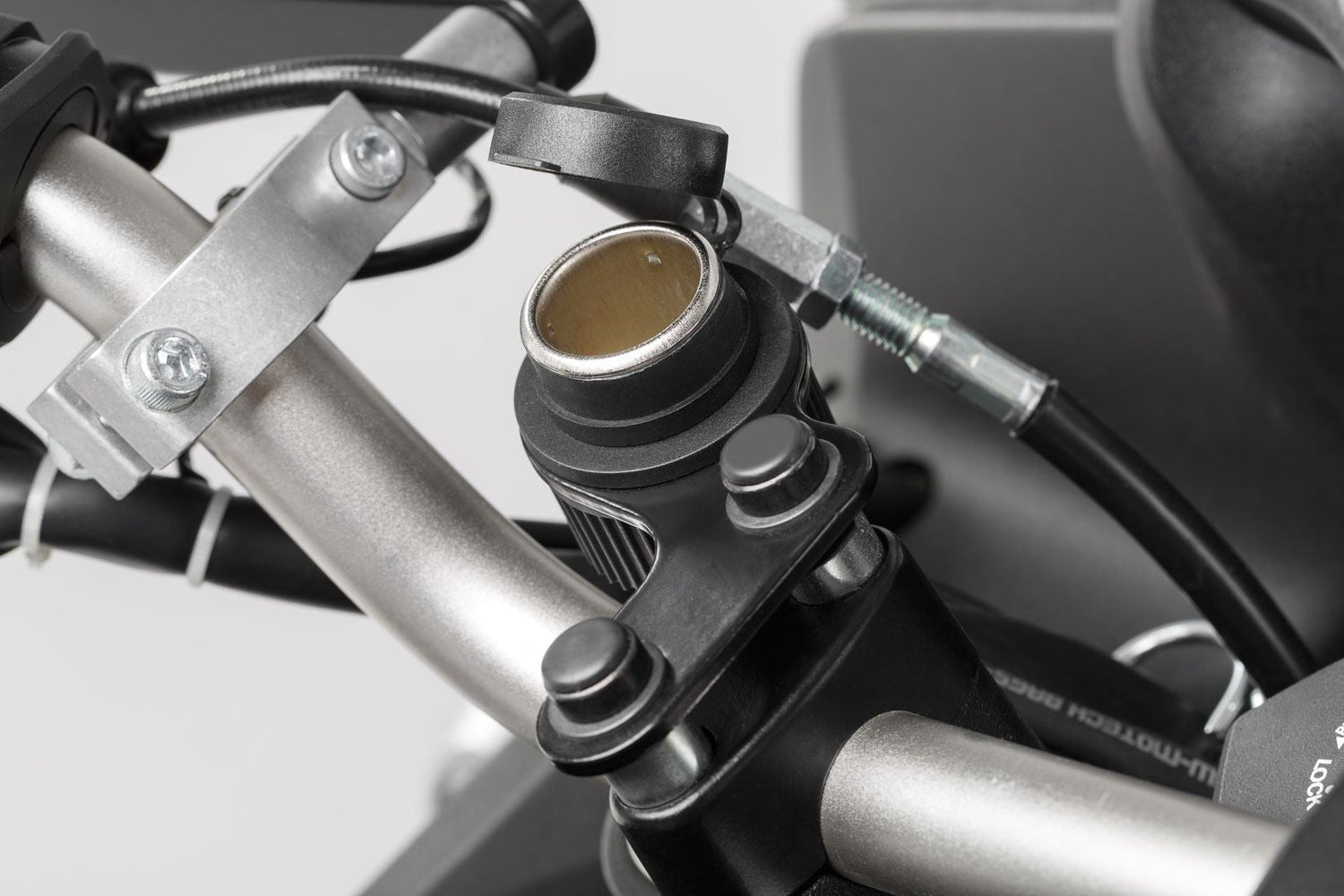 No built-in power socket? No problem! This cigarette lighter outletcan be connected directly to the motorcycle battery via the suppliedcable harness. The high-quality outlet and completely insulated cable harnessare protected from splashing water by rubber seals. To mountthe cigarette lighter, we recommend mounting plates (available separately), which can be attached to the bar mount with M8 or M10 screws.