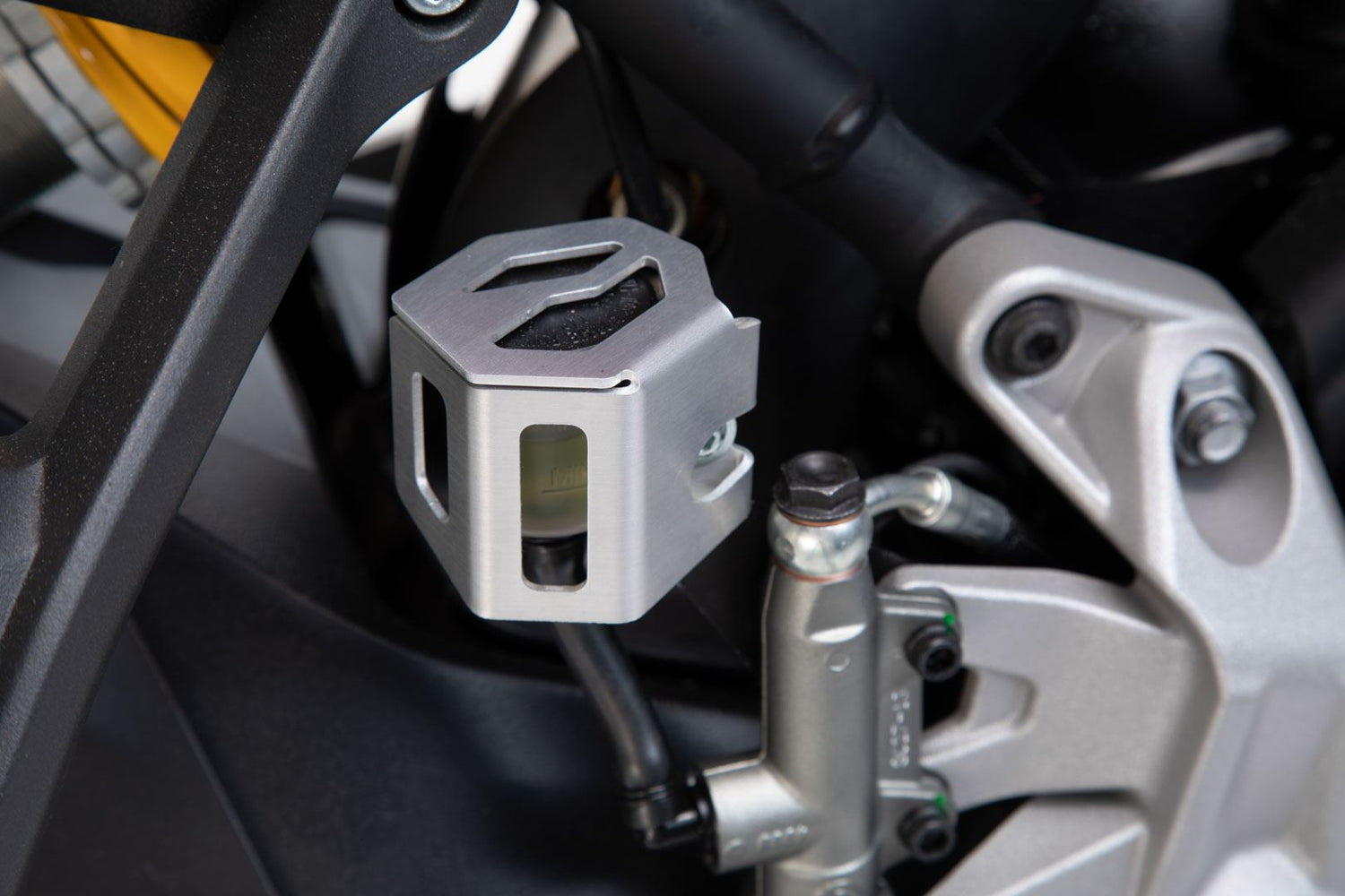 Protector set machined of high strength aluminium alloy for right and left engine case cover. The elegant construction protects exposed case parts from ground contact and in a fall, effectively protects from greater damage. The protectors are made of black anodized light metal, on the left side an interchangable, silver anodized wear part is attached for additional reinforcement.