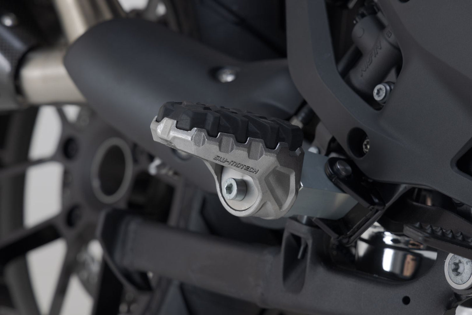 Is your original footrest impossible to position comfortably? Then the EVO footrest kit from SW-MOTECH is the perfect solution for you. This sophisticated system, consisting of rotating elements with firmly interlocking teeth, gives you 36 options for positioning. The position of the footrest can be adjusted so that it's lower or moved forwards or backwards as well as adjusted in terms of its angle to suit your individual needs. The bike-specific joint adapters are simply mounted on to the original parts of the footrest holder. We'll show you how this works in the mounting instructions.