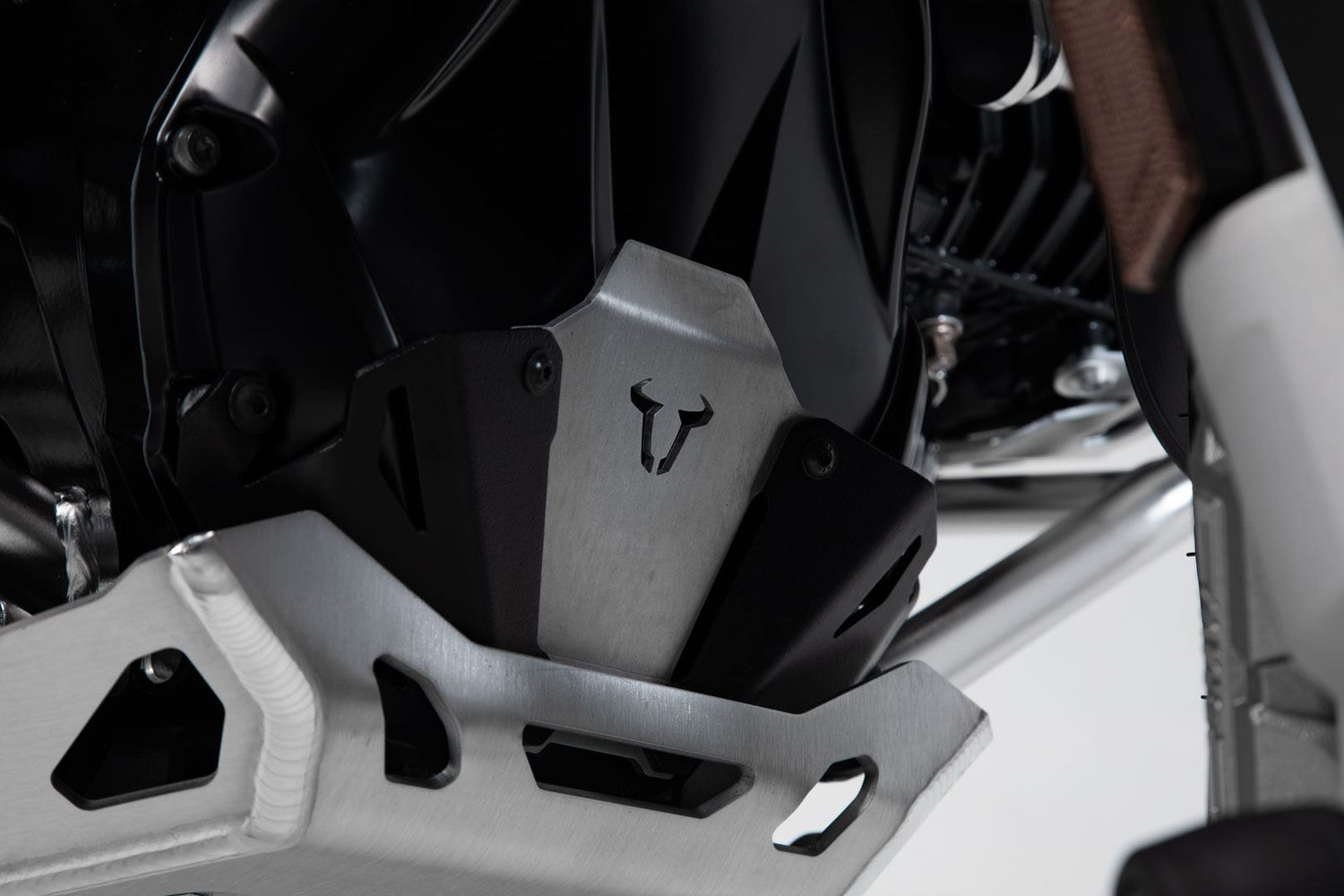 The engine guard extension protects the front area of the engine block from rock chips. Made from brushed and power-coated aluminium, the extension can be mounted on its own or in addition to an SW-MOTECH engine guard.