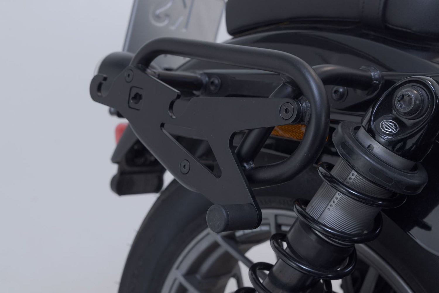 The bike-specific bag carrier can be easily and quickly mounted on to original attachment points on the fender strut. The quick lock system allows LH Legend Gear side bags to be attached and removed in just a few easy hand movements, without the driver foregoing reliable bag fastening.