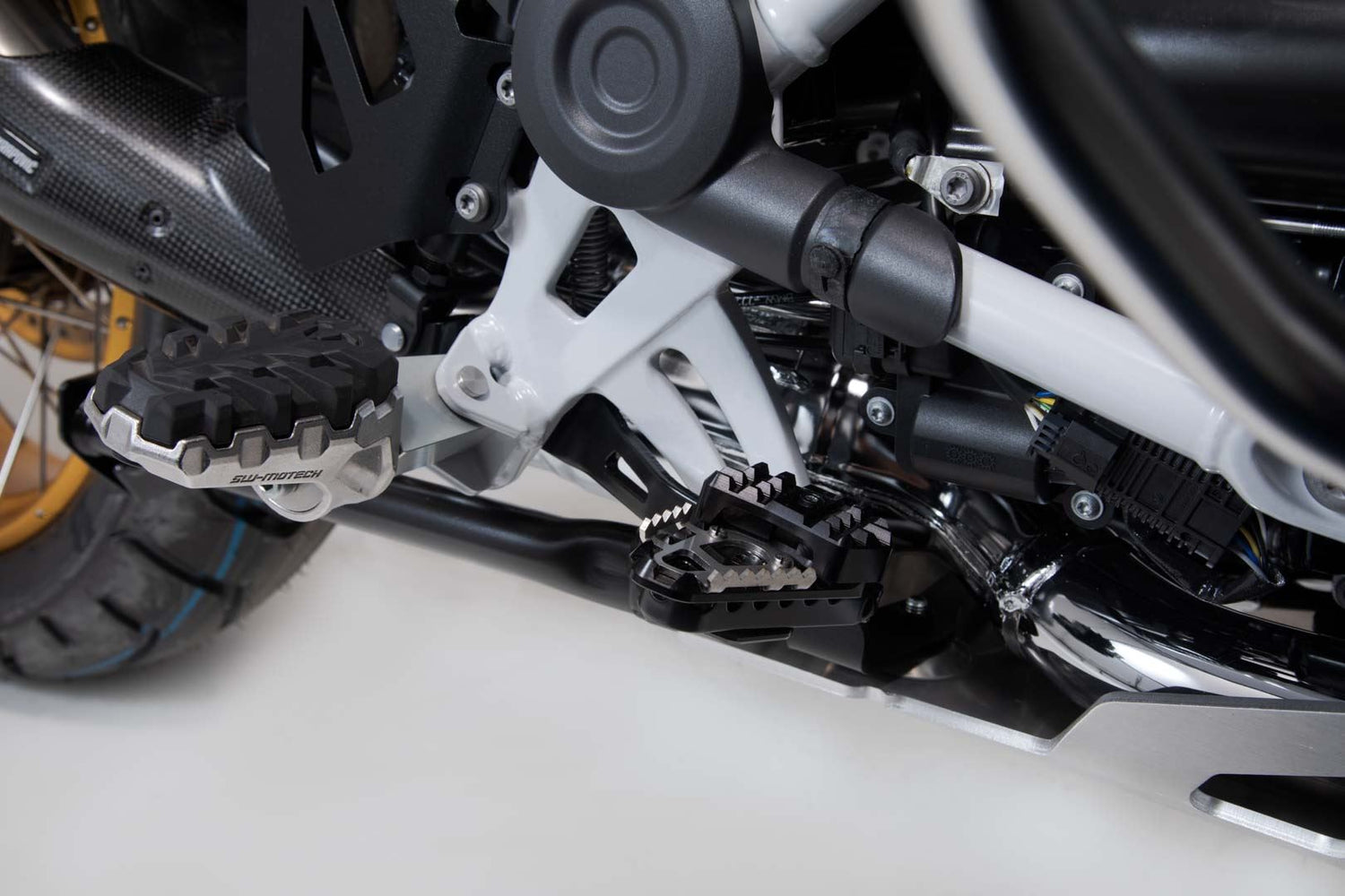 SW-MOTECH manufactures these extensions from high-strength milled aluminum alloy; they feature a black anodized surface and a stainless steel step plate. For optimal ergonomic adjustment, the increase in the brake pedal step can be adjusted in two stages of 22 or 27 millimeters.