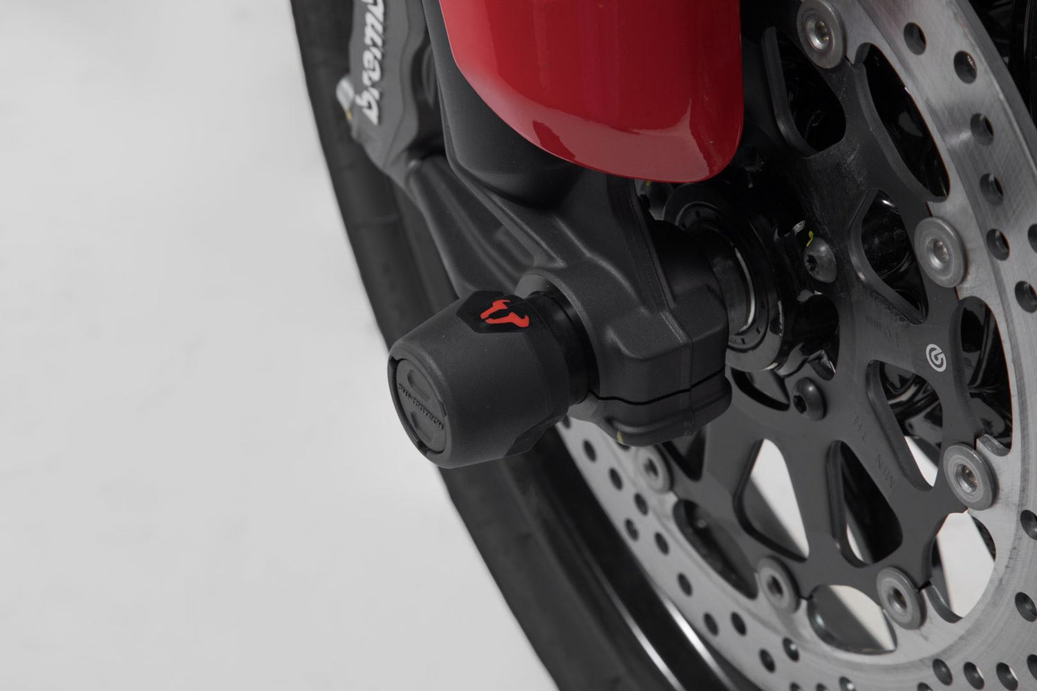 The front axle crash pads made of abrasion-resistant plastic protect the drive shaft from damage in the event of a fall. The smooth surface also provides excellent sliding properties. The polished bull logo in red adds a visual highlight to your motorcycle.