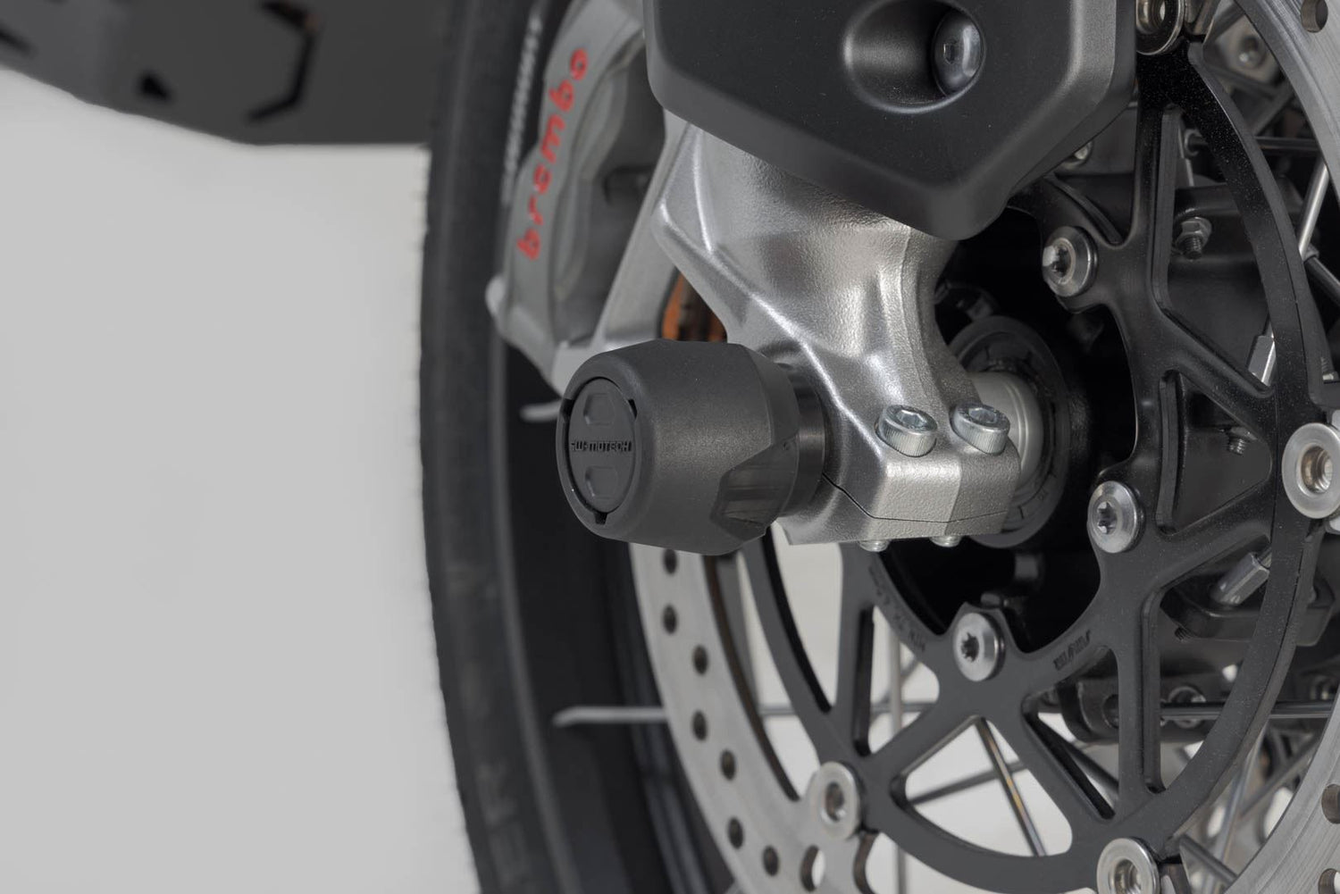 The rear axle crash pads made of abrasion-resistant plastic protect the swing arm from damage in the event of a fall. With a fiberglass content of 30%, the crash pad core is impact-resistant. The smooth surface also provides excellent sliding properties. The polished bull logo in red adds a visual highlight to your motorcycle.